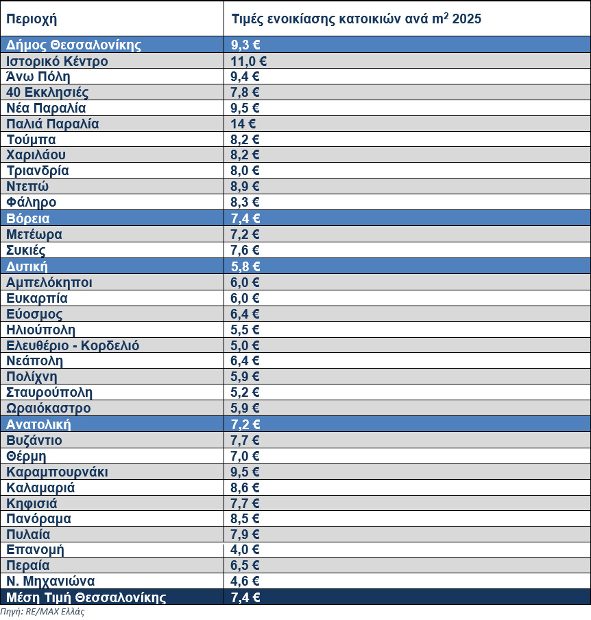 Στον νομό Θεσσαλονίκης, σύμφωνα με τα στοιχεία της RE/MAX Ελλάς, ο κεντρικός δήμος παραμένει στην κορυφή των τιμών ενοικίασης με μέσο όρο 9,3 ευρώ ανά τετραγωνικό μέτρο. Στα βόρεια του νομού, η μέση τιμή διαμορφώθηκε στα 7,4 ευρώ ανά τ.μ., ενώ στα ανατολικά και στα δυτικά η μέση τιμή ενοικίου ανήλθε στα 7,2 ευρώ ανά τ.μ. και 5,8 ευρώ ανά τ.μ. αντίστοιχα. Αξίζει να τονιστεί ότι συνολικά στον νομό Θεσσαλονίκης η μέση τιμή ενοικίασης κατοικιών ανήλθε στα 7,4 ευρώ ανά τ.μ. με το υψηλότερο μέσο ενοίκιο να καταγράφεται στην Παλιά Παραλία και να διαμορφώνεται σε 14 ευρώ ανά τετραγωνικό μέτρο.