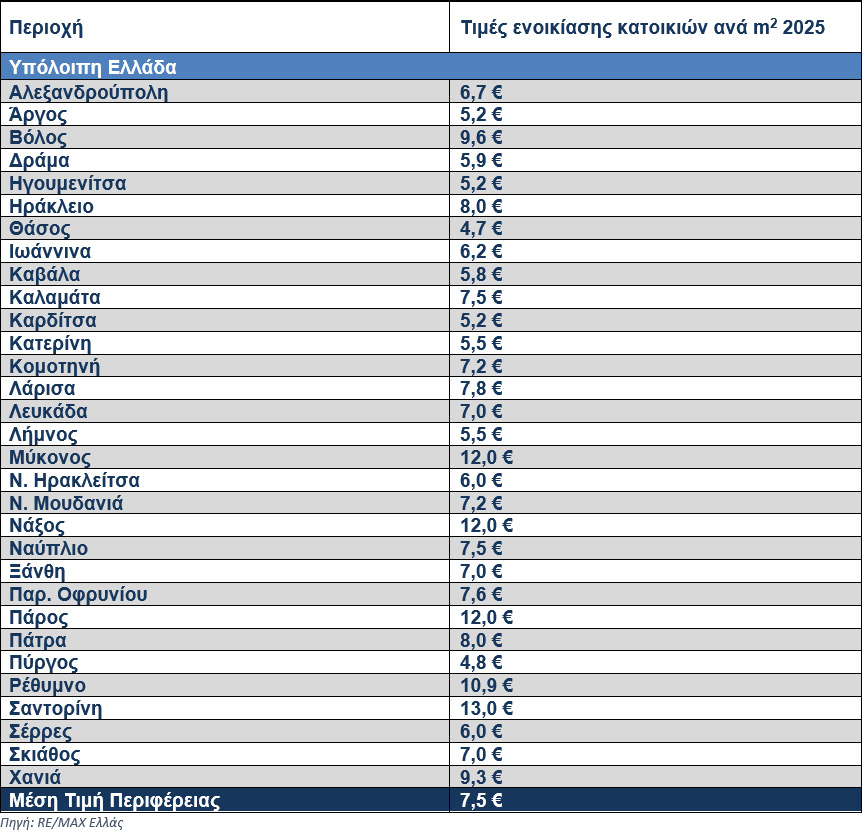 Από την άλλη, οι υψηλότερες μέσες τιμές ενοικίων καταγράφονται, σύμφωνα με τη RE/MAX Ελλάς, στη Σαντορίνη (13 ευρώ ανά τ.μ.), τη Μύκονο, την Πάρο και τη Νάξο (12 ευρώ ανά τ.μ.) και στο Ρέθυμνο (10,9 ευρώ ανά τ.μ.).