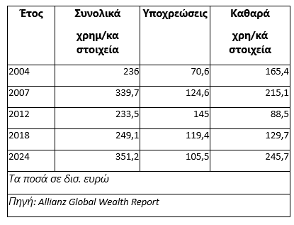 Συγκρίνοντας τα πράγματα στο επίπεδο της περιόδου 2004-2024 (βλέπε στοιχεία παρατιθέμενου πίνακα), προκύπτει ότι η καθαρή χρηματοοικονομική περιουσία των ελληνικών νοικοκυριών την περυσινή χρονιά: