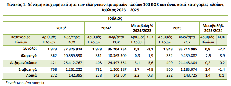 Η Ολική Χωρητικότητα του Ελληνικού Εμπορικού Στόλου, από πλοία 100 ΚΟΧ και άνω, παρουσίασε μείωση κατά 2,7% τον μήνα Ιούλιο 2025 σε σύγκριση με την αντίστοιχη χωρητικότητα του Ιουλίου 2024. Μείωση 3,1% είχε σημειωθεί και κατά την αντίστοιχη σύγκριση του Ιουλίου του έτους 2024 προς τον Ιούλιο 2023.