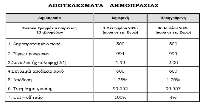 Δημοπρασία εντόκων γραμματίων διάρκειας 13 εβδομάδων, ύψους 500 εκατ. ευρώ, διενεργήθηκε σήμερα (1/10).