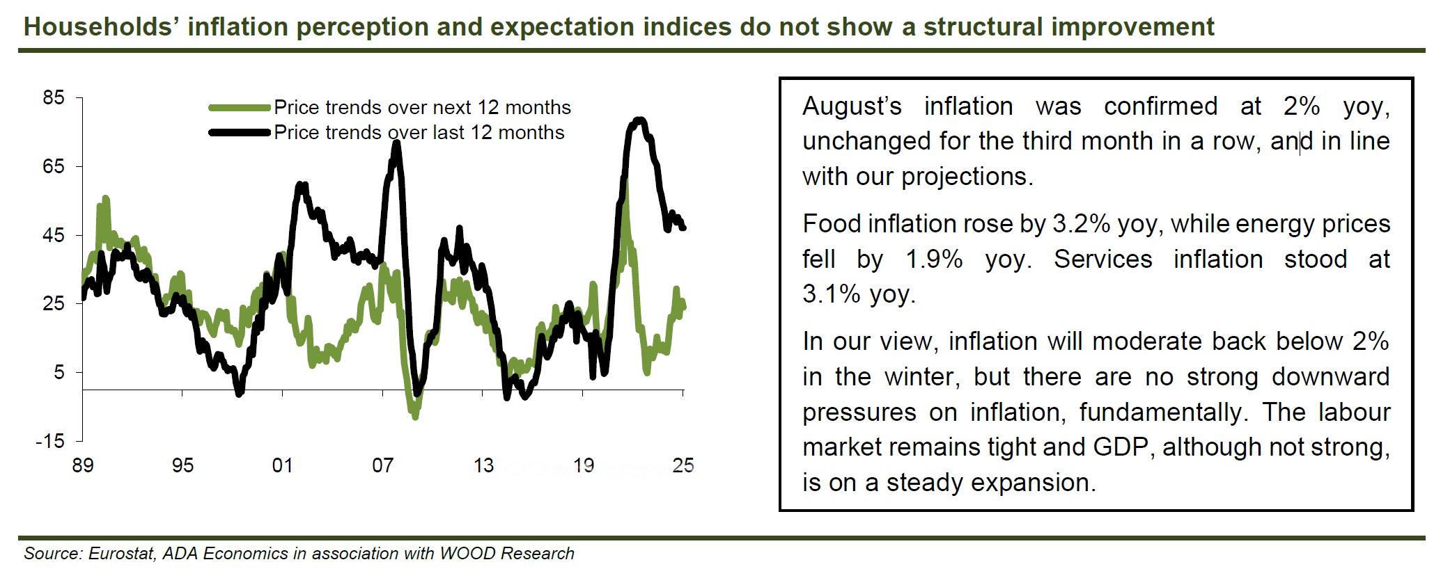 Στις ΗΠΑ, η εικόνα είναι πιο δυναμική: το ΑΕΠ τρίτου τριμήνου «τρέχει» στο 3,9% σύμφωνα με το Atlanta Fed, με την WOOD να αναθεωρεί ανοδικά τις προβλέψεις της στο 2,1% για το 2025 και 2,3% για το 2026, πάνω από το consensus. Ο πληθωρισμός ανέβηκε στο 2,9% τον Αύγουστο, με τις πιέσεις να προέρχονται από τρόφιμα, ενέργεια και μεταφορές, αλλά η τράπεζα εκτιμά ότι θα σταθεροποιηθεί γύρω στο 3% φέτος και στο 2,5–2,8% το 2026.