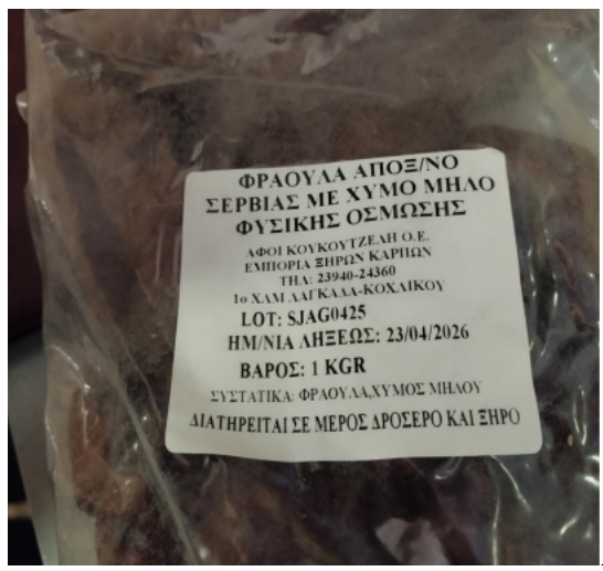 Το Τμήμα Εμπορίου της Δ/νσης Ανάπτυξης της Περιφερειακής Ενότητας Ξάνθης στο πλαίσιο προγράμματος συνεργασίας με τον ΕΦΕΤ έτους 2025 για τον έλεγχο προσθέτων τροφίμων και αρωματικών ουσιών σε διάφορα είδη τροφίμων, προέβη σε δειγματοληψία τροφίμου με στοιχεία «Φράουλα αποξηραμένη με χυμό μήλου φυσικής όσμωσης» προέλευσης Σερβίας σε πλαστική κλειστή συσκευασία 1Kg, με αριθμό παρτίδας SJAG0425, ανάλωση κατά προτίμηση πριν από: 23/04/2026, που διατίθεται από την επιχείρηση «ΑΦΟΙ ΚΟΥΚΟΥΤΖΕΛΗ Ο.Ε.» με έδρα στον 1ο χλμ Λαγκαδά-Κολχικού.