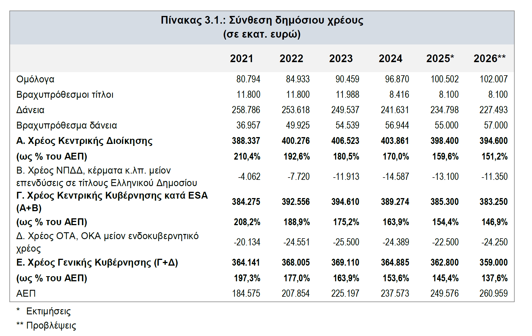 Το χρέος της Γενικής Κυβέρνησης εκτιμάται ότι θα διαμορφωθεί στα 362,8 δισ. ευρώ το 2025, που αντιστοιχεί σε 145,4% του ΑΕΠ, έναντι 153,6% το 2024, καταγράφοντας μείωση 8,2 ποσοστιαίων μονάδων. Για το 2026, το χρέος προβλέπεται να υποχωρήσει περαιτέρω στα 359 δισ. ευρώ ή 137,6% του ΑΕΠ, δηλαδή κατά ακόμη 7,8 ποσοστιαίες μονάδες.