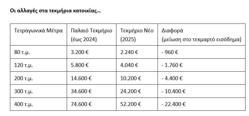 Για παράδειγμα, για μια κατοικία 80 τετραγωνικών μέτρων, με τον σημερινό οριακό συντελεστή το τεκμήριο είναι 40 ευρώ ανά τετραγωνικό μέτρο, οπότε η αντικειμενική δαπάνη είναι 3.200 ευρώ. Πλέον, ο οριακός συντελεστής είναι 28 ευρώ ανά τετραγωνικό μέτρο και η αντικειμενική δαπάνη 2.240 ευρώ. Δηλαδή προκύπτει μείωση κατά 30%.