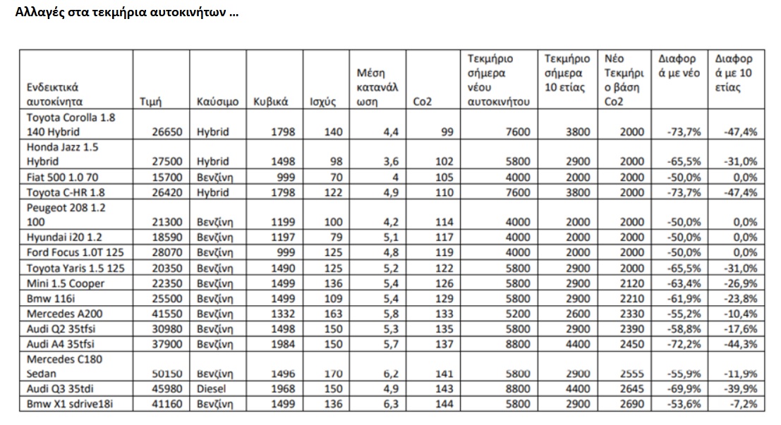 - Για όλα τα Ι.Χ. παλαιότητας μέχρι 15 ετών, δηλαδή για όσα έχουν ταξινομηθεί μετά την 1η Νοεμβρίου 2010, οι αντικειμενικές δαπάνες θα προσδιορίζονται με βάση τις εκπομπές Co2 (κατ’ αναλογία με τα τέλη κυκλοφορίας), με σημαντική μείωση των αντικειμενικών δαπανών, προσομοιάζοντας το ύψος των αντικειμενικών δαπανών που έχουν σήμερα τα αυτοκίνητα άνω των δέκα ετών. Από αυτόν τον νέο τρόπο υπολογισμού θα προκύψουν μειώσεις στα ποσά των τεκμηρίων που θα είναι μεγαλύτερες και θα ξεπερνούν ακόμη και το 50% για τα Ι.Χ. νέας τεχνολογίας και παλαιότητας μέχρι 5 ετών και μικρότερες για αυτοκίνητα παλαιότητας 10 ετών.