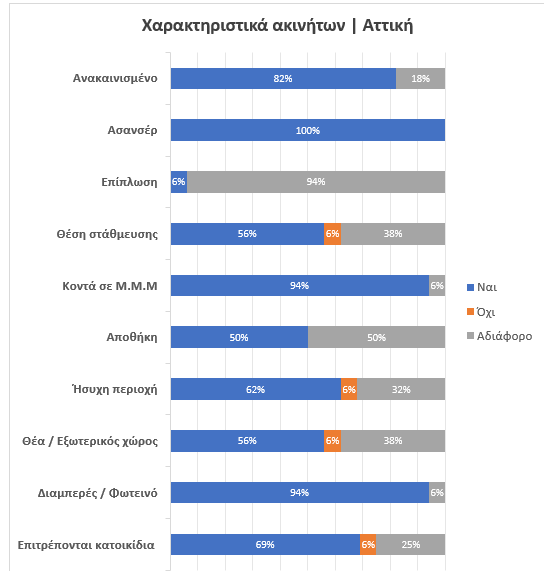 Στα χαρακτηριστικά των ακινήτων, οι περισσότεροι ενοικιαστές στην Αττική αναζητούν διαμερίσματα διαμπερή και φωτεινά σε ποσοστό 94%, σε ήσυχες περιοχές σε ποσοστό 62%, την ύπαρξη εξωτερικού χώρου ή θέας και χώρου στάθμευσης (56%). Η ανακαίνιση είναι ζητούμενο για το 82% των ενοικιαστών, ενώ ιδιαίτερη σημασία δίνεται και στα κουφώματα, με το 69% να προτιμά κουφώματα αλουμινίου και το 25% νέας τεχνολογίας (PVC κ.λπ.). Στη θέρμανση, το 75% ζητά φυσικό αέριο, ενώ το ενδιαφέρον για Smart Home αυτοματισμούς παραμένει σχετικά περιορισμένο (19% επιθυμητό, 81% αδιάφορο). Τέλος, η πρόσβαση σε μέσα μαζικής μεταφοράς παραμένει βασική προτεραιότητα για το 94% των ενοικιαστών.