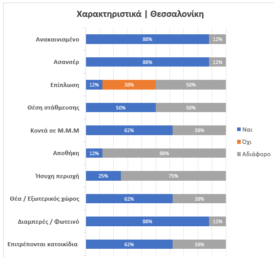 Στα ποιοτικά χαρακτηριστικά, το 88% των ενοικιαστών ζητά διαμπερή και φωτεινά σπίτια, ενώ ποσοστό 62% δίνει έμφαση σε θέα ή εξωτερικό χώρο και στην εγγύτητα σε μέσα μαζικής μεταφοράς. Η ήσυχη περιοχή φαίνεται να αποτελεί προτεραιότητα μόνο για το 25% των ενοικιαστών. Η ύπαρξη αποθήκης απασχολεί περιορισμένο ποσοστό ενδιαφερόμενων ενοικιαστών (12%), ενώ στην επίπλωση υπάρχει ποικιλία στις επιλογές: το 50% ζητά ακίνητο χωρίς επίπλωση, το 12% επιπλωμένο, ενώ το 38% δηλώνει αδιάφορο για το αν το ακίνητο είναι ή όχι επιπλωμένο. Η θέρμανση με φυσικό αέριο είναι καθολικά ζητούμενο στη Θεσσαλονίκη σε ποσοστό 100%.
