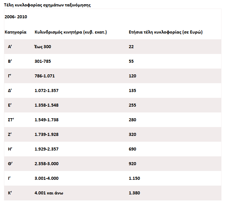 Για αυτοκίνητα με ταξινόμηση από 1.11.2010 έως 31.12.2020, τα τέλη διαμορφώνονται ως εξής: