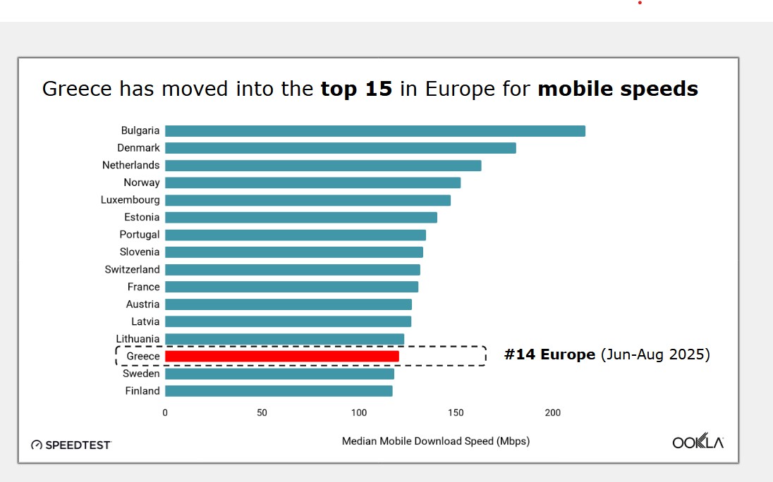 Σύμφωνα με τα στοιχεία που παρουσίασε ο Luke Kehoe, industry analyst της Ookla, κατά τη διάρκεια του Advanced Telecoms Summit 2025, η Ελλάδα βρίσκεται στο top 15 των ευρωπαϊκών χωρών όσον αφορά τις ταχύτητες του δικτύου κινητής τηλεφωνίας.