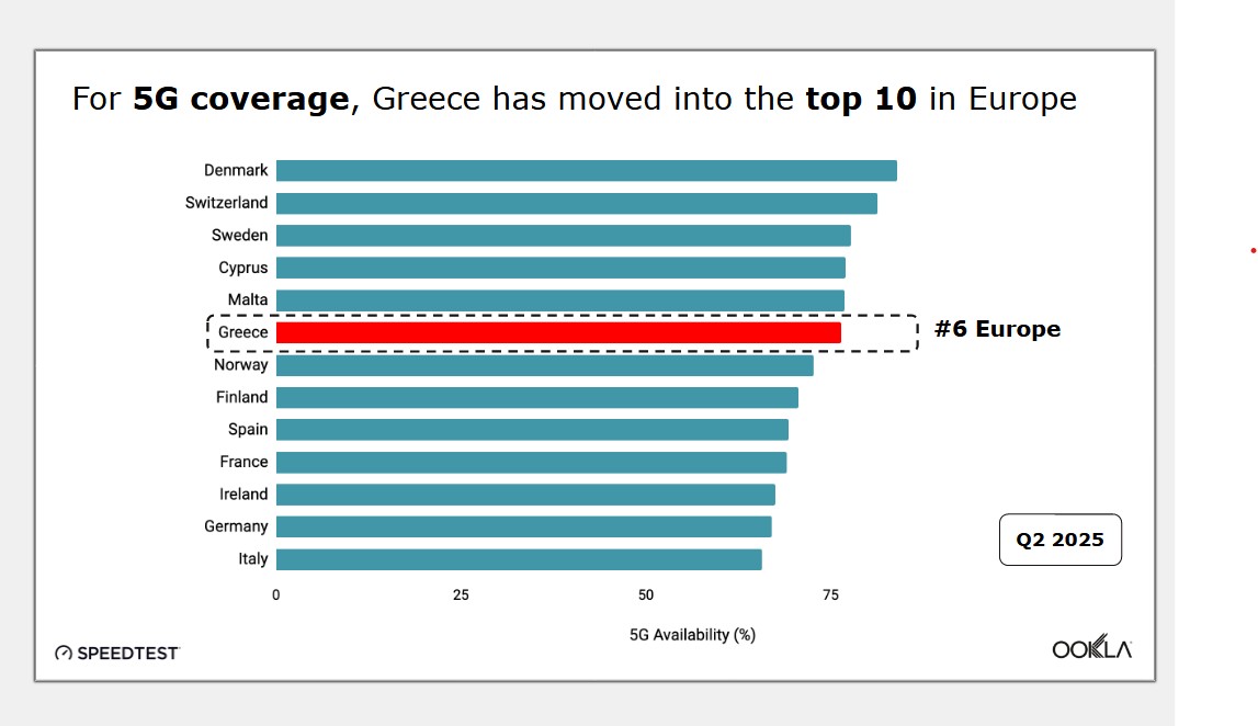 Την ίδια ώρα, σύμφωνα με τον Kehoe η Ελλάδα είναι αρκετά ανταγωνιστική και όσον αφορά την κάλυψη 5G, καθώς ανέβηκε στο top 10 της Ευρώπης το δεύτερο τρίμηνο του 2025, καταλαμβάνοντας την 6η θέση της κατάταξης. Στην πρώτη τριάδα σε αυτή την περίπτωση βρίσκονται η Δανία, η Ελβετία και η Σουηδία, ενώ αξίζει να σημειωθεί ότι η Κύπρος βρίσκεται στην τέταρτη θέση.