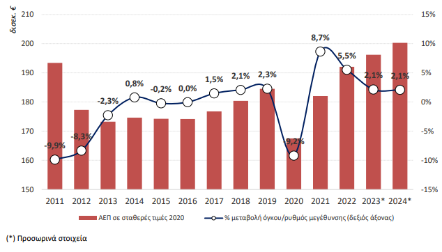 Με βάση τα αναθεωρημένα στοιχεία, το Ακαθάριστο Εγχώριο Προϊόν (ΑΕΠ) του έτους 2024 σε όρους όγκου παρουσίασε αύξηση κατά 2,1% σε σχέση με το 2023, έναντι αύξησης 2,3% που είχε ανακοινωθεί στην πρώτη εκτίμηση, τον Μάρτιο 2025.