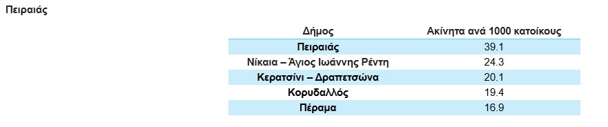 Η Περιφερειακή Ενότητα Πειραιά παρουσιάζει διαφοροποιημένη εικόνα ως προς τον ΔΚΠΚ, με τους περισσότερους δήμους να καταγράφουν χαμηλές τιμές και περιορισμένη διαθεσιμότητα ακινήτων προς πώληση.
