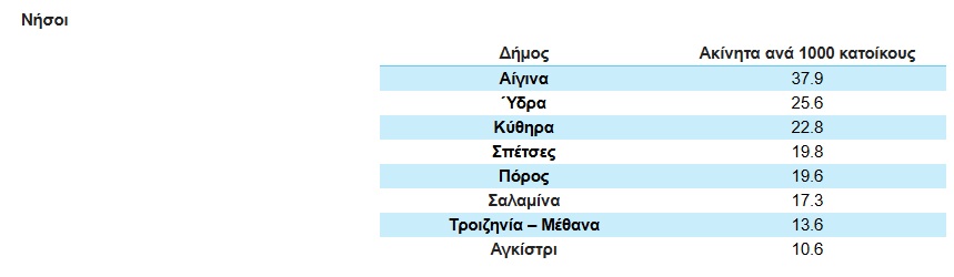 Σε παράκτιες και νησιωτικές περιοχές παρατηρούνται υψηλότερες τιμές του δείκτη, αντανακλώντας τη συγκέντρωση επενδυτικού και παραθεριστικού ενδιαφέροντος. Η Κασσάνδρα, η Κέα και ο Σαρωνικός καταγράφουν τις υψηλότερες τιμές πανελλαδικά, γεγονός που αποτυπώνει τη σημαντική προσφορά εξοχικών και παραθεριστικών κατοικιών.