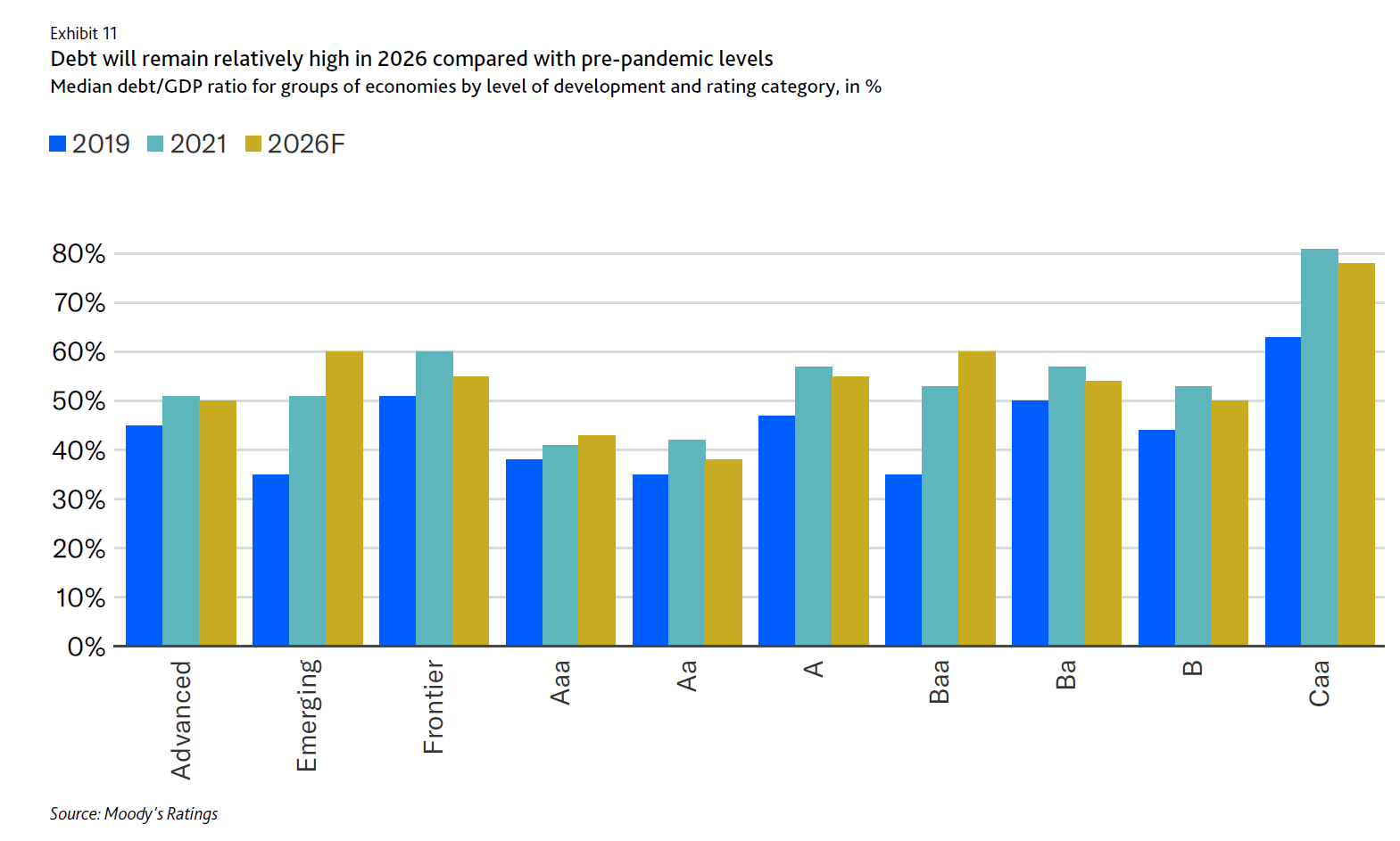Για την Ελλάδα, η Moody’s προβλέπει μείωση του δημόσιου χρέους κατά περισσότερες από 4 ποσοστιαίες μονάδες του ΑΕΠ το 2026, αποδίδοντας αυτή τη βελτίωση στη συνετή δημοσιονομική πολιτική που έχει επιλεχθεί από την κυβέρνηση της χώρας και η οποία επικεντρώνεται στη μείωση του χρέους. Η Ελλάδα συμμετέχει σε ένα «κλειστό club» χωρών διεθνώς που θα σημειώσουν ουσιαστική αποκλιμάκωση στους δείκτες χρέους, σε μια χρονιά όπου η πλειονότητα των κρατών θα διατηρήσει σχεδόν σταθερά τα πρωτογενή της αποτελέσματα, αφήνοντας το χρέος σε υψηλά μετα-πανδημικά επίπεδα.