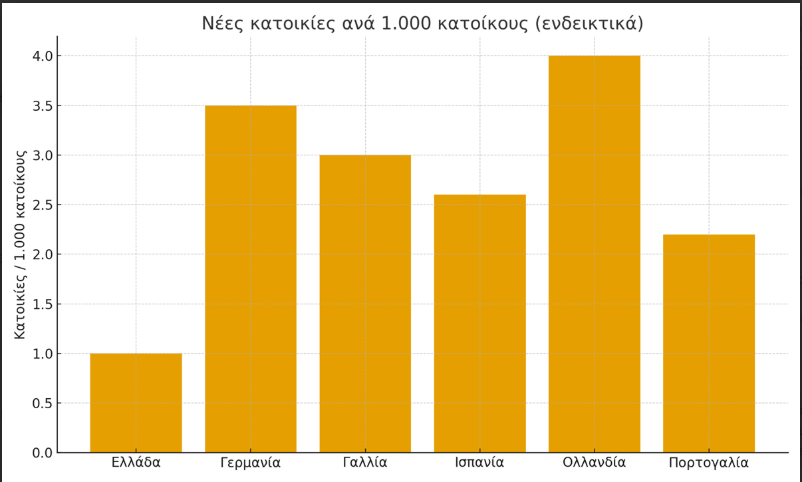 Ετήσια παραγωγή νέων κατοικιών ανά 1.000 κατοίκους – Η Ελλάδα τελευταία (Eurostat 2024).