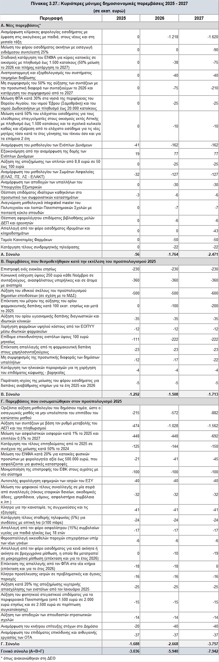 Το συνολικό κόστος των δημοσιονομικών παρεμβάσεων που έχουν νομοθετηθεί ή ανακοινωθεί για την περίοδο 2025 - 2027, όπως αποτυπώνεται και στον ακόλουθο πίνακα, ανέρχεται σε 3,04 δισ. ευρώ για το 2025, αυξανόμενο σε 5,94 δισ. ευρώ το 2026 (επιπλέον 2,9 δισ. ευρώ σε σχέση με το 2025) και σε 7,94 δισ. ευρώ το 2027 (επιπλέον 2 δισ. ευρώ σε σχέση με το 2026).
