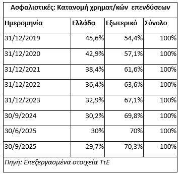 Αξιοσημείωτο είναι ότι το ποσοστό των ελληνικών assets μειώνεται σταδιακά κατά τα τελευταία χρόνια, καθώς ενώ στις 30/9/2025 βρέθηκε στο 29,7%, στο τέλος του 2023 είχε διαμορφωθεί στο 32,9%, στο τέλος του 2022 στο 36,4% και στο τέλος του 2019 στο 45,6%!