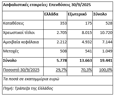 Συγκεκριμένα, (βλέπε στοιχεία παρατιθέμενων πινάκων), στις 30 Σεπτεμβρίου του 2025 από το σύνολο του χρηματοοικονομικού χαρτοφυλακίου ύψους 19,44 δισ. ευρώ, μόλις τα 5,78 δισ. ευρώ (το 29,7%) ήταν τοποθετημένα στην Ελλάδα. Ειδικότερα κατά το τρίτο φετινό τρίμηνο παρατηρήθηκαν πωλήσεις τόσο εγχώριων χρεωστικών τίτλων (-5 εκατ.), όσο και μετοχών (-99 εκατ.) με αντίστοιχες αυξήσεις θέσεων στο εξωτερικό (+134 και +82 εκατ. ευρώ, αντίστοιχα).