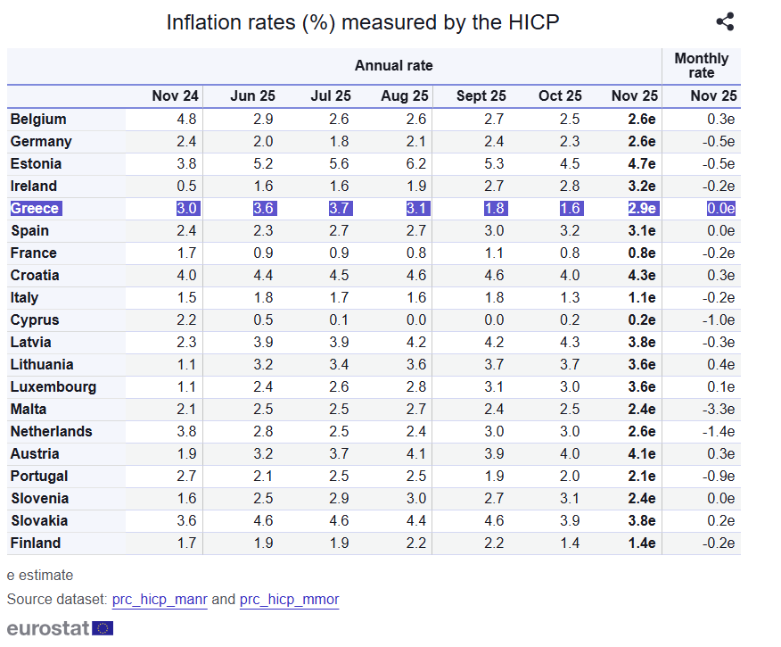 Στο 2,9% έκανε άλμα ο ετήσιος πληθωρισμός στην Ελλάδα τον Νοέμβριο, σύμφωνα με τη Eurostat. Ενα μήνα πριν, ήταν στο 1,6%.