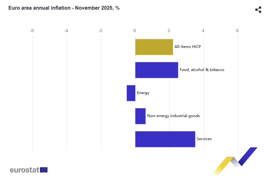 Εξετάζοντας τα κύρια συστατικά του πληθωρισμού στη ζώνη του ευρώ, οι υπηρεσίες έχουν τον υψηλότερο ετήσιο ρυθμό τον Νοέμβριο (3,5%, έναντι 3,4% τον Οκτώβριο), ακολουθούμενες από τα τρόφιμα, το αλκοόλ και τον καπνό (2,5%, σταθερά σε σύγκριση με τον Οκτώβριο), τα μη ενεργειακά βιομηχανικά προϊόντα (0,6%, σταθερά σε σύγκριση με τον Οκτώβριο) και την Ενέργεια (-0,5%, έναντι -0,9% τον Οκτώβριο).
