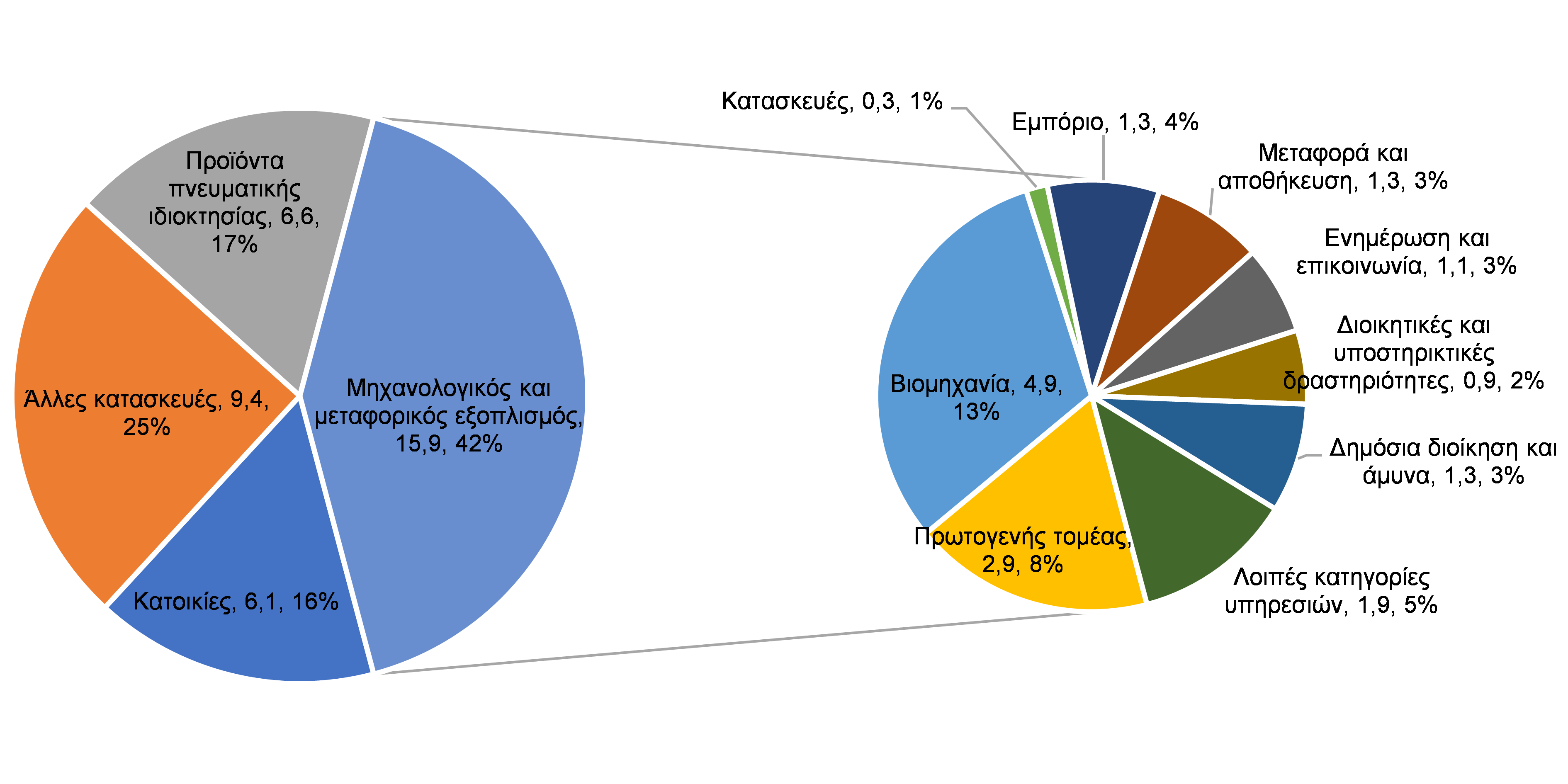 Ανάλυση των επενδύσεων ανά κατηγορία και οι κλάδοι της οικονομίας που επένδυσαν σε μηχανολογικό και μεταφορικό εξοπλισμό (στοιχεία 2024, σε Ευρώ δισ. (τρέχουσες τιμές) και ποσοστό)