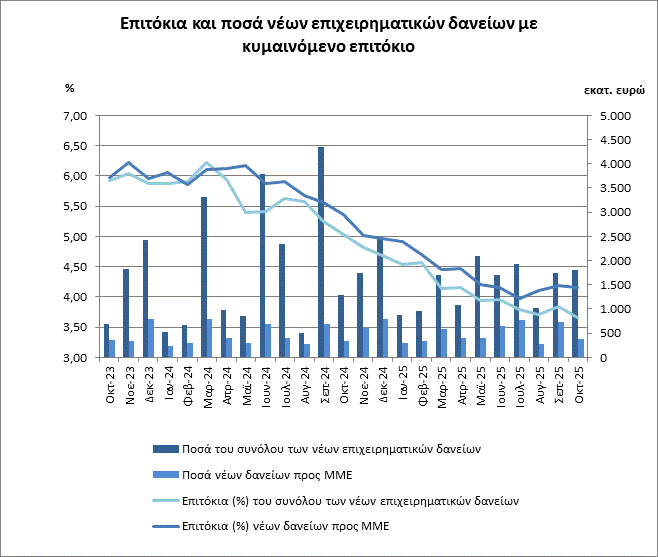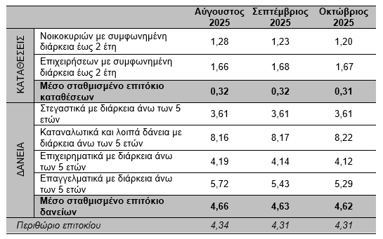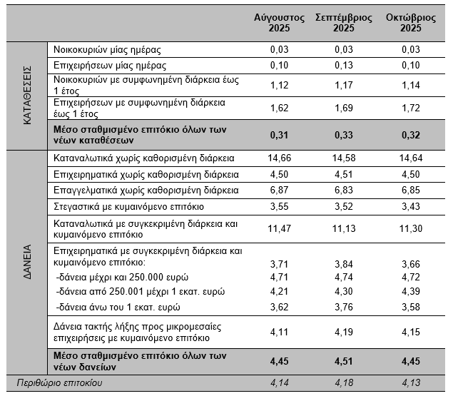 Βάσει των ίδιων στοιχείων, τον Οκτώβριο του 2025, τα μέσα σταθμισμένα επιτόκια του συνόλου των υφιστάμενων καταθέσεων και δανείων παρέμειναν σχεδόν αμετάβλητα στο 0,31% και 4,62% αντίστοιχα. Έτσι Το περιθώριο επιτοκίου μεταξύ των υφιστάμενων καταθέσεων και δανείων παρέμεινε αμετάβλητο στις 4,31 εκατοστιαίες μονάδες.
