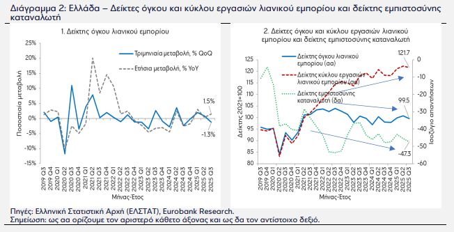 Η εξέλιξη κάποιων δεικτών οικονομικής συγκυρίας και δραστηριότητας της ελληνικής οικονομίας το γ’ τρίμηνο 2025 είχε ως εξής: