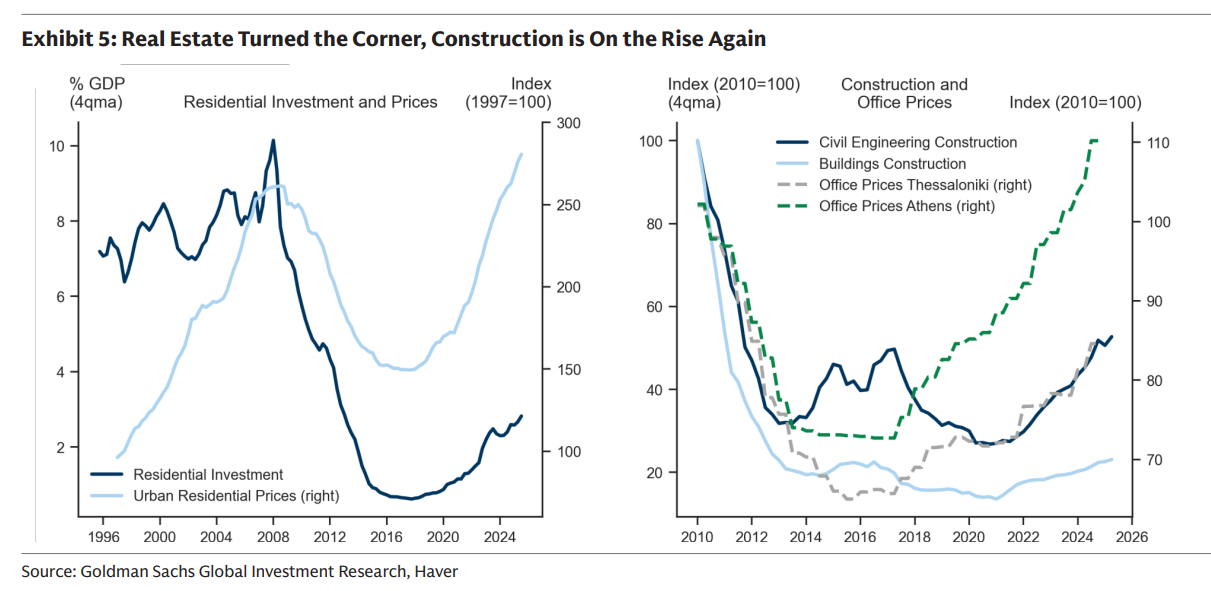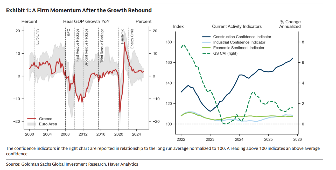 Η Ελλάδα συνεχίζει να υπερβαίνει τον μέσο όρο της Ευρωζώνης, με την Goldman Sachs να βλέπει ότι η περίοδος σταθερής ανάπτυξης όχι μόνο δεν εξαντλείται αλλά αποκτά ακόμη πιο «ανθεκτικά» χαρακτηριστικά.