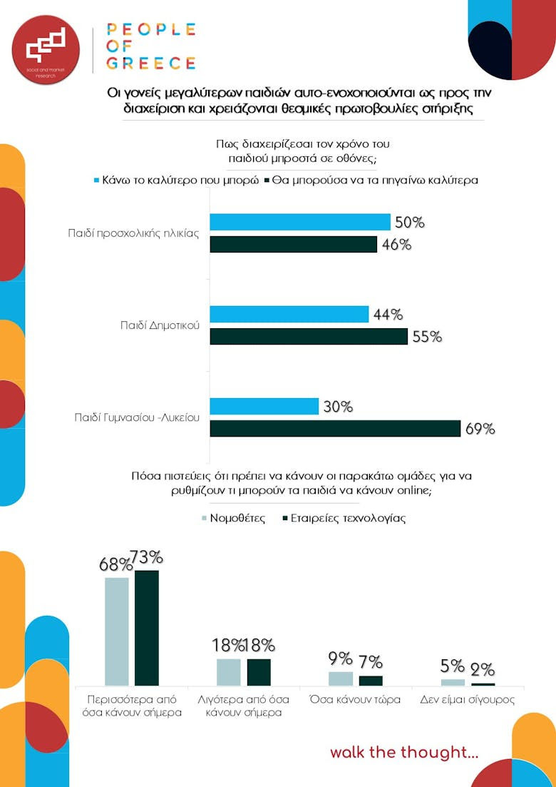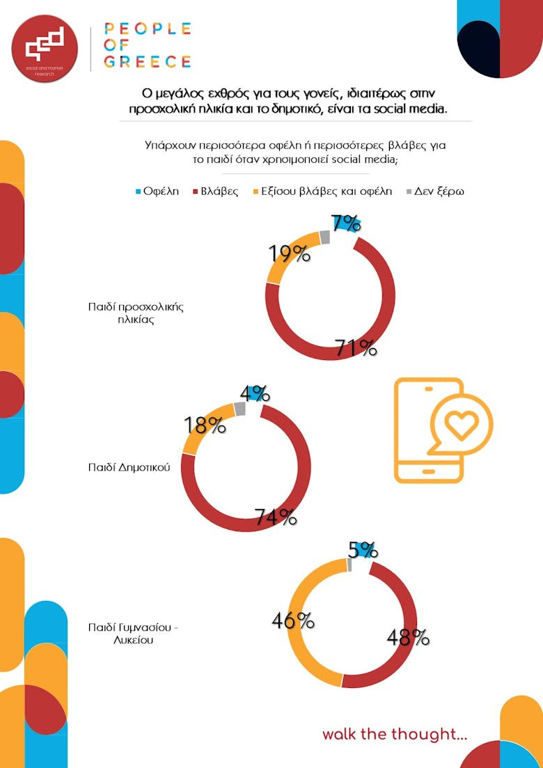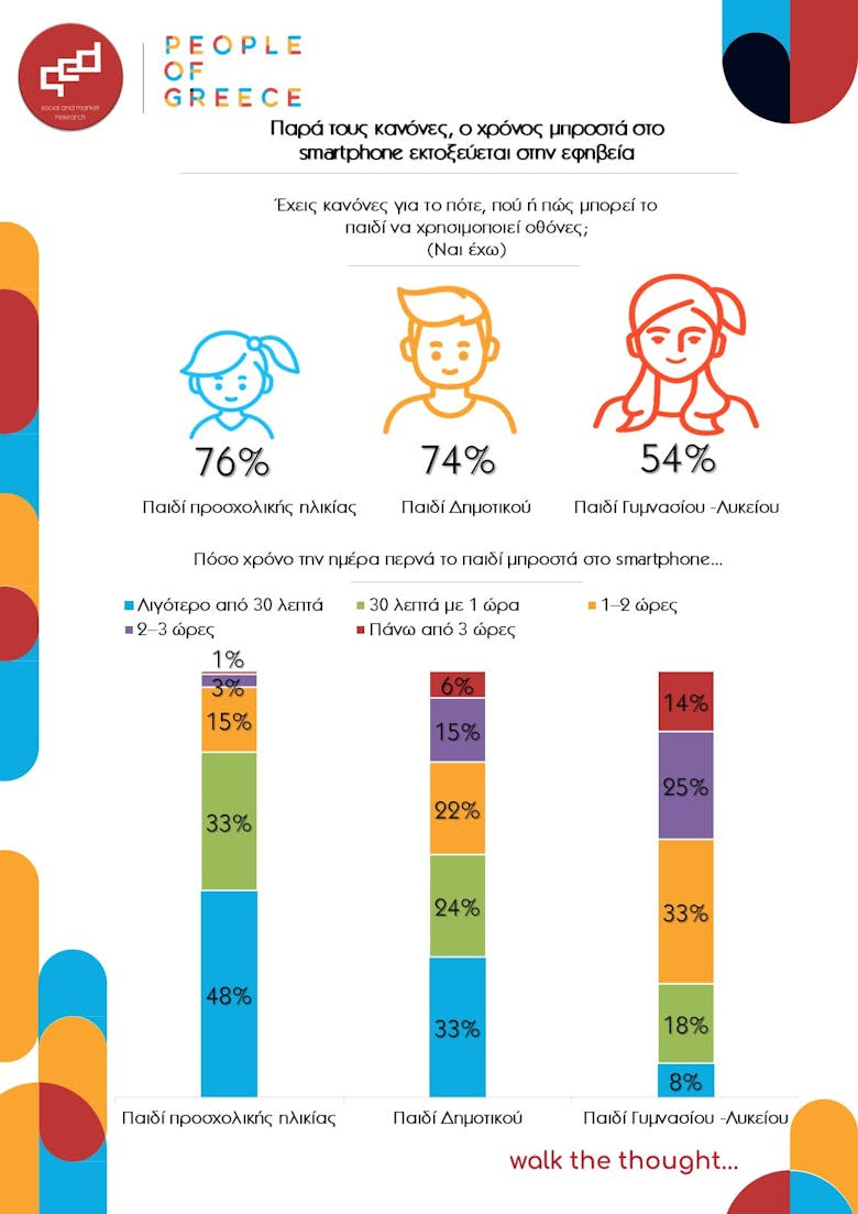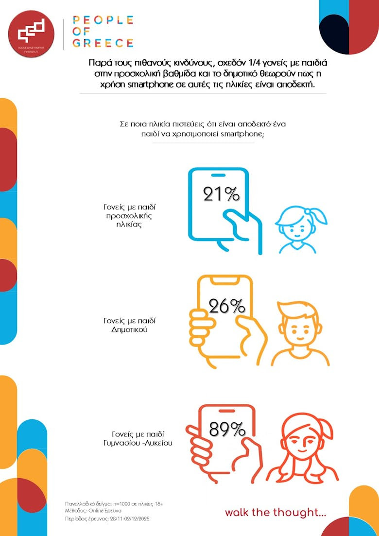 Η έρευνα παρουσιάζει τη χρήση smartphones και social media από παιδιά στην Ελλάδα, μέσα από τα μάτια των ίδιων των γονιών. Οι γονείς αναγνωρίζουν την αντίφαση: θέτουν κανόνες, όμως αυτοί σπάνια τηρούνται μετά το Δημοτικό.