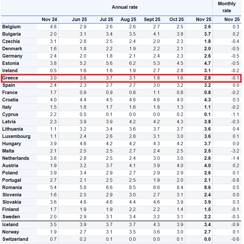 Τα χαμηλότερα ετήσια ποσοστά καταγράφηκαν στην Κύπρο (0,1%), τη Γαλλία (0,8%) και την Ιταλία (1,1%). Τα υψηλότερα ετήσια ποσοστά καταγράφηκαν στη Ρουμανία (8,6%), την Εσθονία (4,7%) και την Κροατία (4,3%). Σε σύγκριση με τον Οκτώβριο του 2025, ο πληθωρισμός σε ετήσια βάση υποχώρησε σε δώδεκα κράτη-μέλη, παρέμεινε σταθερός σε πέντε και αυξήθηκε σε δέκα.