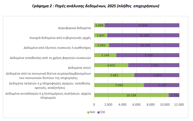 Μάλιστα, το συνολικό ποσοστό των επιχειρήσεων που πραγματοποίησαν ανάλυση δεδομένων είτε από τους υπαλλήλους τους είτε από εξωτερικό προμηθευτή έφτανε το 31,8%.