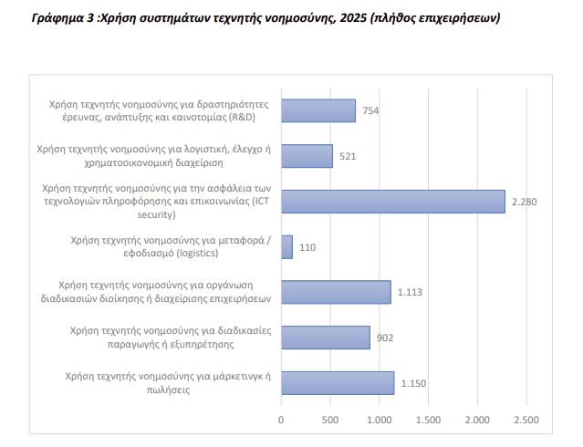 Την ίδια ώρα, το 8,2% των επιχειρήσεων που έχουν πρόσβαση στο διαδίκτυο χρησιμοποιούν συστήματα Τεχνητής Νοημοσύνης για τουλάχιστον μια από τις παρακάτω χρήσεις: