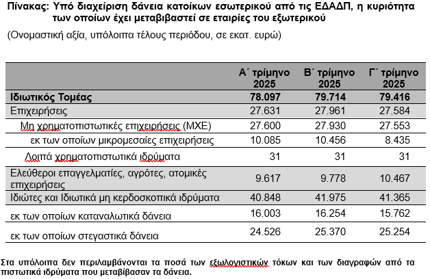 Η ονομαστική αξία των υπό διαχείριση επιχειρηματικών δανείων μειώθηκε σε 27.584 εκατ. ευρώ στο τέλος του γ΄ τριμήνου του 2025, από 27.961 εκατ. ευρώ στο τέλος του προηγούμενου τριμήνου.