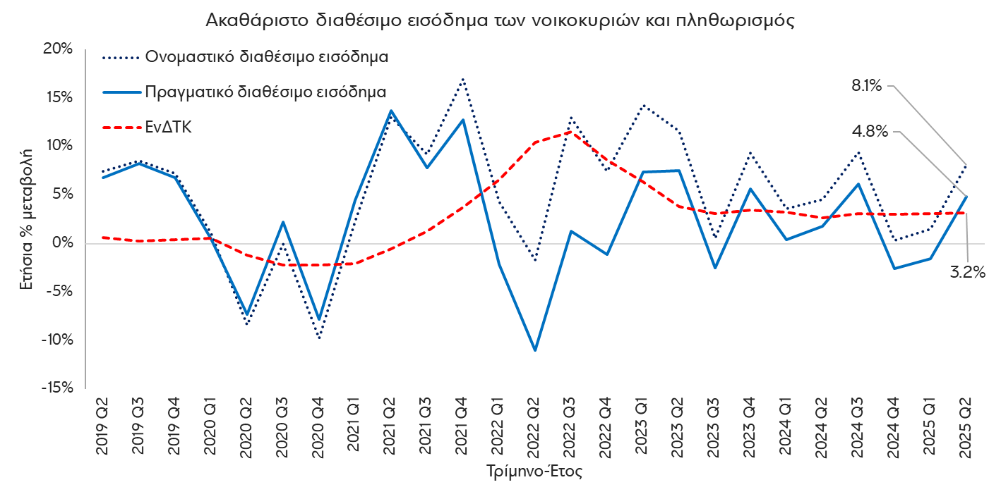 Το διαθέσιμο εισόδημα των νοικοκυριών στην Ελλάδα ανήλθε στα €41,9 δισεκ. το β’ τρίμηνο 2025, σημειώνοντας ετήσια αύξηση κατά 8,1% (€3,2 δισεκ.). Η αντίστοιχη ενίσχυση σε πραγματικούς όρους, δηλαδή αφαιρώντας την επίδραση της ανόδου των τιμών στο ονομαστικό διαθέσιμο εισόδημα των νοικοκυριών, ήταν ηπιότερη στο 4,8% (Διάγραμμα 1[2]. Τέλος, σε επίπεδο εξαμήνου (α’ εξάμηνο 2025), το διαθέσιμο εισόδημα των νοικοκυριών στην Ελλάδα αυξήθηκε σε ετήσια βάση κατά 4,9% (1,7% σε πραγματικούς όρους), ενώ σε σύγκριση με το α’ εξάμηνο 2019, δηλαδή σε σχέση με τα αντίστοιχα προ πανδημίας επίπεδα, ήταν ενισχυμένο κατά 28,9% (8,2% σε πραγματικούς όρους).