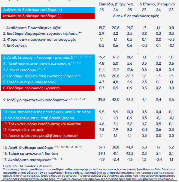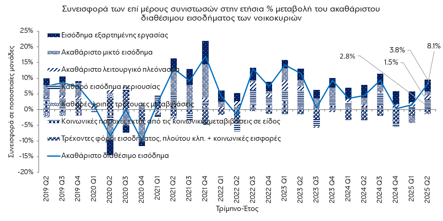 Συνεπώς, τα θετικά στοιχεία της εγχώριας αγοράς εργασίας -μείωση του ποσοστού ανεργίας, αύξηση της απασχόλησης και των μισθών- αντανακλώνται στο διαθέσιμο εισόδημα των νοικοκυριών αντισταθμίζοντας σε έναν βαθμό, για άλλους εργαζομένους περισσότερο και για άλλους λιγότερο, τις αρνητικές συνέπειες του πληθωρισμού. Τέλος, πέραν των αμοιβών εξαρτημένης εργασίας, σημαντική συνεισφορά στην αύξηση του διαθέσιμου εισοδήματος των νοικοκυριών στην Ελλάδα το β’ τρίμηνο 2025 είχαν το εισόδημα περιουσίας (αποδόσεις χρηματοοικονομικών επενδύσεων), το μικτό εισόδημα (κέρδη ατομικών επιχειρήσεων) και το λειτουργικό πλεόνασμα (εισόδημα από την ιδιοκτησία κατοικιών).