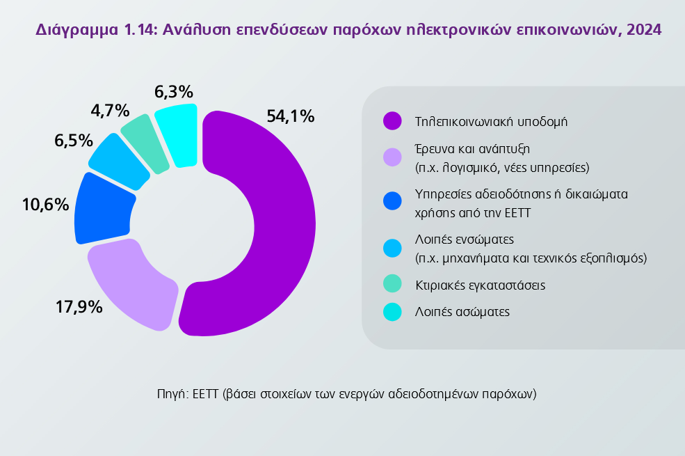 Ωστόσο, οι επενδύσεις των παρόχων ηλεκτρονικών επικοινωνιών αυξήθηκαν κατά 10% σε σχέση με το 2023, ανερχόμενες περίπου στο 1,1 δισ. ευρώ και στο 22,9% του κύκλου εργασιών τους.
