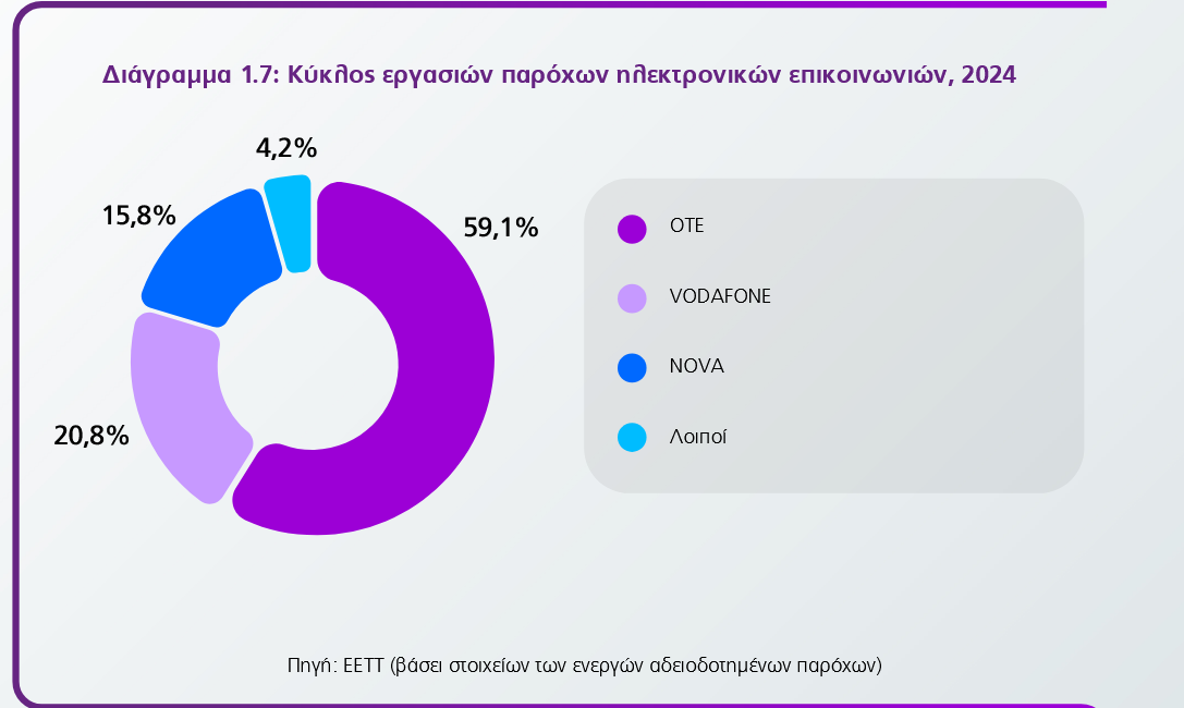 Σε αυτό το σημείο, αξίζει να σημειωθεί ότι περίπου το 96% του κύκλου εργασιών στον τηλεπικοινωνιακό κλάδο προέρχεται από τρεις επιχειρήσεις, με τον ΟΤΕ να κατέχει μερίδιο 59,1%, ακολουθούμενος από τη VODAFONE (20,8%) και τη NOVA (15,8%).
