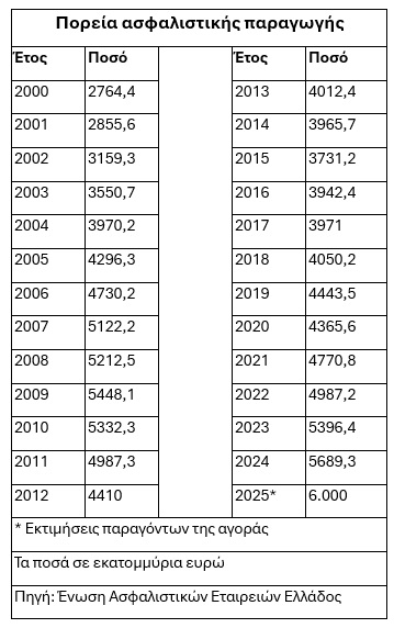 Σύμφωνα με εκτιμήσεις, η φετινή ασφαλιστική παραγωγή θα κλείσει κοντά στα έξι δισ. ευρώ (έναντι 5,69 δισ. ευρώ πέρυσι, βλέπε στοιχεία παρατιθέμενου πίνακα) επίδοση που αποτελεί ιστορικό ρεκόρ, καθώς ξεπερνά (σε τρέχουσες και όχι σε αποπληθωρισμένες τιμές) και τα προ οικονομικής κρίσης επίπεδα (πχ 5,45 δισ. ευρώ το 2009).