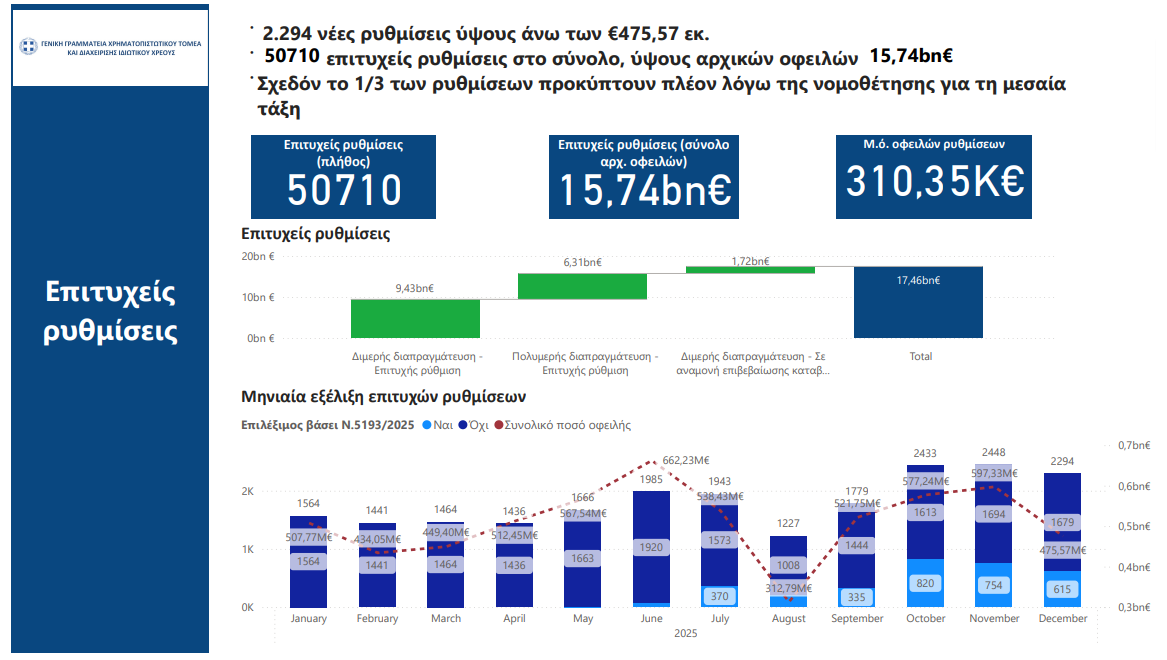 Συγκεκριμένα, τον μήνα Δεκέμβριο 2025, οι επιτυχείς ρυθμίσεις έφτασαν τις 2.294, εκ των οποίων: