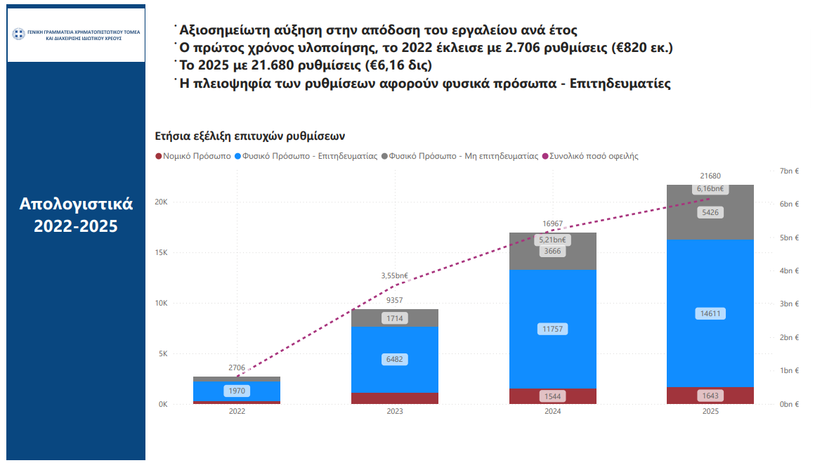 O 4ος χρόνος εφαρμογής του εργαλείου κλείνει με ευρεία αύξηση σε σχέση με τα προηγούμενα έτη. Αξίζει να σημειωθεί ότι κατά το 2022, πρώτο χρόνο λειτουργίας, επετεύχθησαν 2.706 ρυθμίσεις -αριθμός που σήμερα είναι πιο κοντά στις μηνιαίες ρυθμίσεις. Ενώ εντός του 2025 σημειώθηκαν 21.680 επιτυχείς αναδιαρθρώσεις. Συγκρίνοντας τις επιδόσεις των 2 ετών, η αύξηση είναι της τάξεως του 700%.