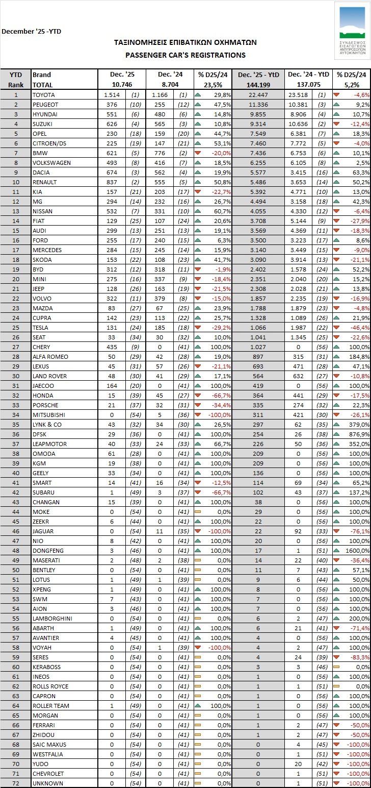 Οι κερδισμένοι στην αγορά του αυτοκινήτου το 2025, σύμφωνα με τα επίσημα στοιχεία των πωλήσεων του ΣΕΑΑ (Σύνδεσμος Εισαγωγέων Αντιπροσώπων Αυτοκινήτων): Peugeot +9,2%, Hyundai +10,7%, Opel +18,3%, BMW +10,1%, VW +2,5%, Dacia +63,3%, Renault +50,2%, Kia +13%, MG +42,3%, Ford +8,6%, BYD +52,2%, MINI 15,2%, Jeep +13,8%, Cupra +21,9%, Chery 100%, Alfa Romeo 184,8%, Lexus +47,1%, Jaecoo 100%, Porsche 22,3% κ.α.