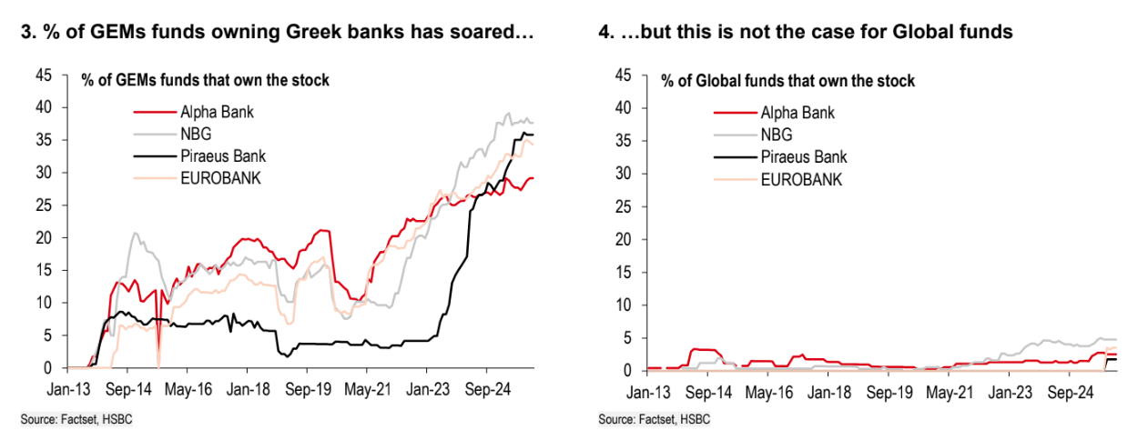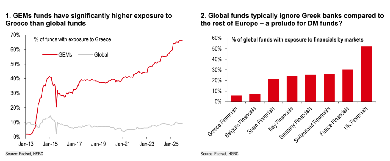 Το ουσιαστικό ζήτημα, σύμφωνα με την HSBC, αφορά τους ενεργούς διαχειριστές. Τα στοιχεία τοποθέτησης δείχνουν ότι η Ελλάδα είναι σήμερα «οικεία» στα κεφάλαια αναδυόμενων αγορών, με περίπου έξι στα δέκα να διατηρούν έκθεση. Αντίθετα, στα παγκόσμια και αναπτυγμένων αγορών κεφάλαια, η παρουσία της χώρας είναι οριακή. Αυτό σημαίνει ότι η έξοδος από το σύμπαν των αναδυόμενων αγορών μπορεί να προκαλέσει απώλεια επενδυτικής προσοχής, χωρίς να υπάρχει εγγύηση ότι αυτή θα αναπληρωθεί.