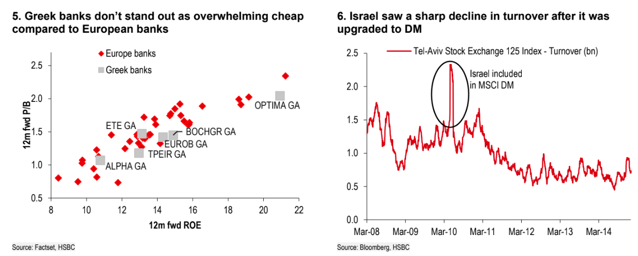 Σε επίπεδο παθητικών κεφαλαίων, η εικόνα είναι τεχνική και σε μεγάλο βαθμό προεξοφλημένη. Τα κεφάλαια που ακολουθούν δείκτες αναδυόμενων αγορών θα υποχρεωθούν να μειώσουν την έκθεσή τους, ενώ εκείνα που ακολουθούν δείκτες αναπτυγμένων αγορών θα κληθούν να τοποθετηθούν. Όμως η Ελλάδα, ως αναπτυγμένη αγορά, θα έχει σαφώς μικρότερο βάρος απ’ ό,τι σήμερα, γεγονός που περιορίζει το μέγεθος των δυνητικών εισροών και καθιστά το τελικό ισοζύγιο αβέβαιο.