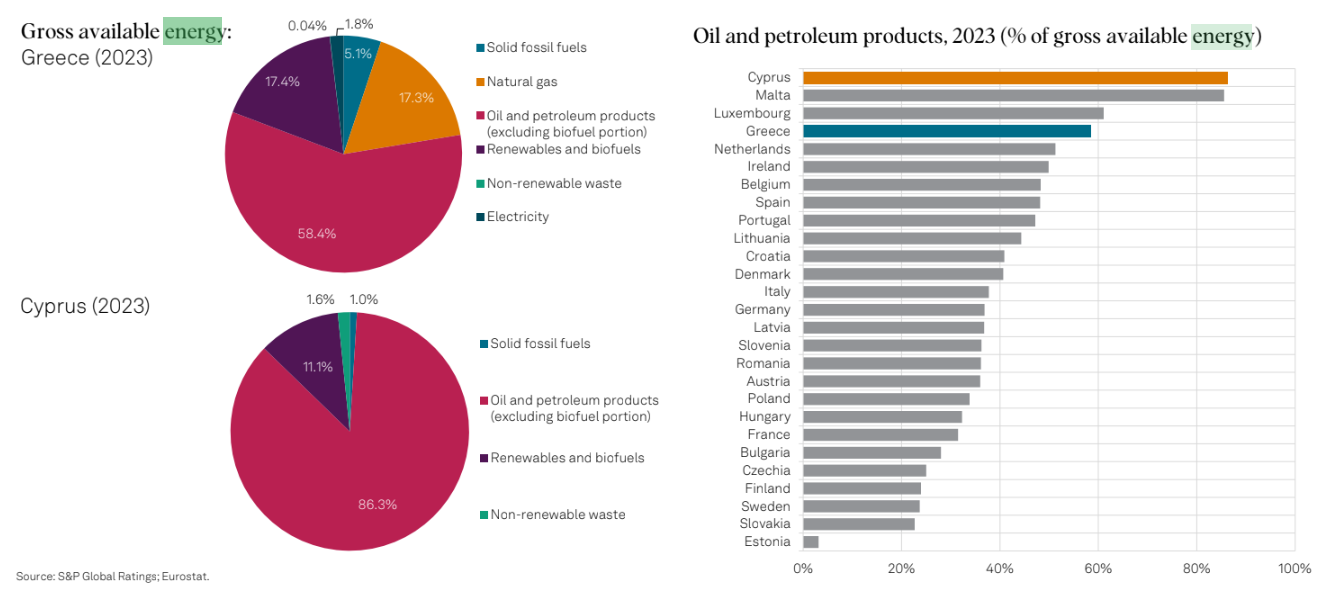Ιδιαίτερη βαρύτητα δίνει η S&P και στο ενεργειακό προφίλ των δύο οικονομιών. Τα διαγράμματα για την εξάρτηση από εισαγόμενους υδρογονάνθρακες τοποθετούν την Ελλάδα και την Κύπρο στις τελευταίες θέσεις της Ευρώπης, με εξαιρετικά υψηλή συμμετοχή πετρελαϊκών προϊόντων στο ενεργειακό μείγμα. Παρά τη σταδιακή αύξηση των ανανεώσιμων πηγών, η εικόνα αυτή εξακολουθεί να επιβαρύνει το εξωτερικό ισοζύγιο και να αυξάνει την ευαισθησία σε διακυμάνσεις των διεθνών τιμών ενέργειας.