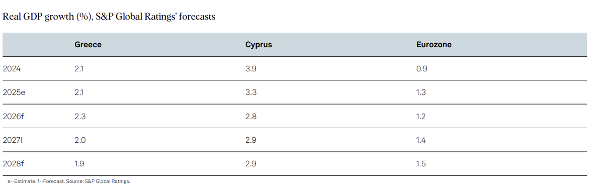 Oι ακριβείς εκτιμήσεις του οίκου για την Ελλάδα είναι 2,1% για το 2025, 2,3% φέτος και μικρή πτώση σε 2% και 1,9% τα επόμενα δύο έτη. Για την Κύπρο, οι ρυθμοί είναι σαφώς υψηλότεροι με 3,3% πέρυσι, 2,8% φέτος και 2,9% για τα επόμενα δύο έτη.