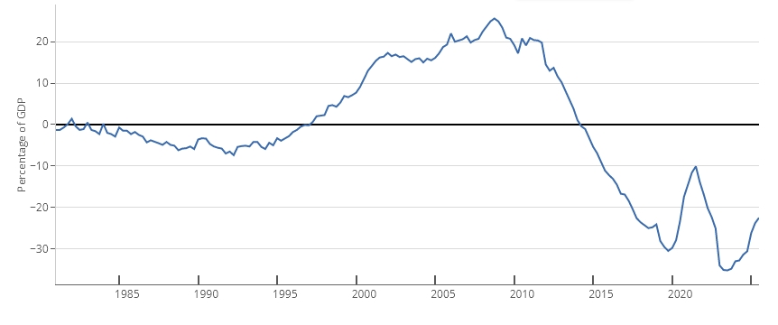 - Το ιστορικό χαμηλό σε αυτή την πορεία σημειώθηκε σχετικά πρόσφατα, το 2ο τρίμηνο του 2023, με το κενό να φθάνει το -35,2%. Από τεχνική άποψη, αυτό συνέβη επειδή ο παρονομαστής (ονομαστικό ΑΕΠ) αυξήθηκε ραγδαία λόγω πληθωρισμού και ανάπτυξης το 2022-2023. Αντίθετα, ο αριθμητής (δάνεια) παρέμεινε στάσιμος ή μειώθηκε ελαφρώς (λόγω αποπληρωμών, διαγραφών και έλλειψης νέου δανεισμού).