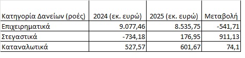 Ο Δεκέμβριος του 2025 ήταν εκρηκτικός (+3.394,44 εκατ.), ενώ υπήρξαν μήνες με σημαντικές αρνητικές ροές, όπως ο Ιανουάριος (-879,64) και ο Ιούλιος (-1.091,38), γεγονός που μαρτυρά μεγάλες αποπληρωμές δανείων από τις επιχειρήσεις που περιόρισαν το τελικό καθαρό αποτέλεσμα.