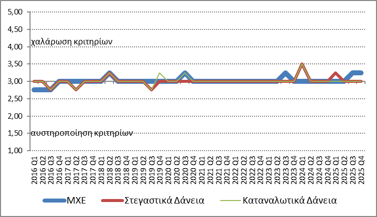 Κατά το δ΄ τρίμηνο του 2025, τα κριτήρια χορήγησης στεγαστικών και καταναλωτικών δανείων προς τα νοικοκυριά παρέμειναν αμετάβλητα, σε σχέση με το γ΄ τρίμηνο του 2025 (Διάγραμμα 1), ενώ αμετάβλητα αναμένεται να παραμείνουν και κατά τη διάρκεια του α΄ τριμήνου του 2026. Οι συνολικοί όροι χορήγησης στεγαστικών δανείων έγιναν πιο χαλαροί ως έναν βαθμό κατά την διάρκεια του δ΄ τριμήνου του 2025, στο πλαίσιο διεύρυνσης της δανειοδοτικής δραστηριότητας κυρίως μέσω της ελάφρυνσης των επιβαρύνσεων εκτός τόκων. Οι συνολικοί όροι χορήγησης των καταναλωτικών και λοιπών δανείων παρέμειναν αμετάβλητοι για το δ΄ τρίμηνο του 2025.