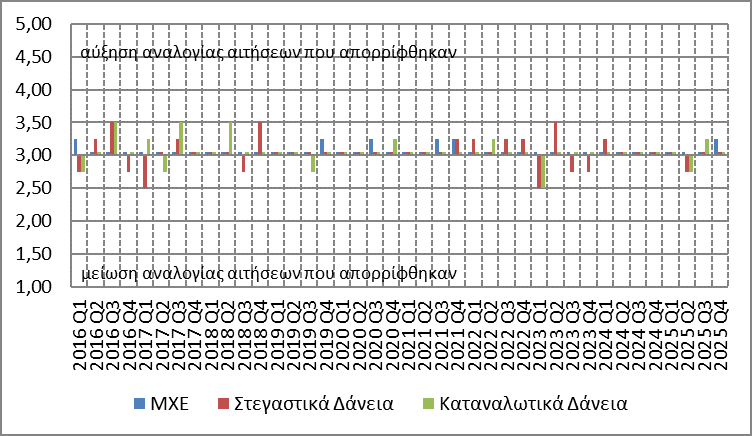Κατά το γ΄ τρίμηνο του 2025, η αναλογία των αιτήσεων για στεγαστικά και καταναλωτικά δάνεια που απορρίφθηκαν παρέμεινε αμετάβλητη (Διάγραμμα 3).